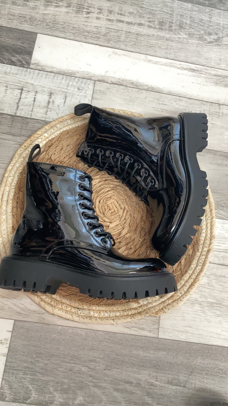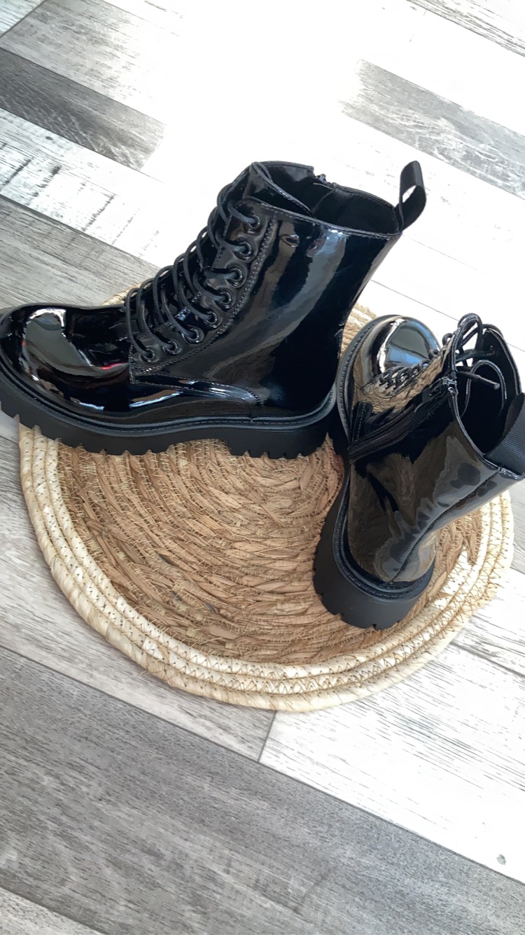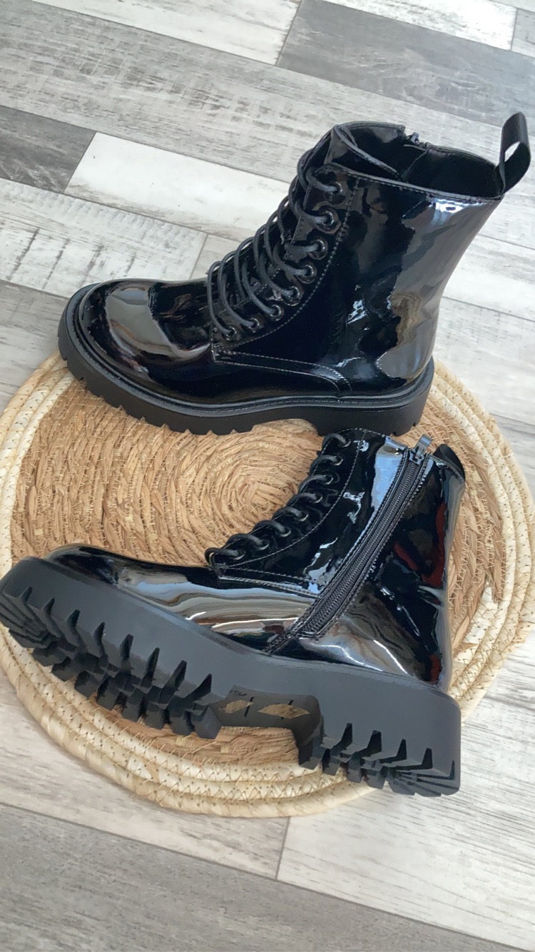 - Bottines femme style rangers, cuir synthétique verni