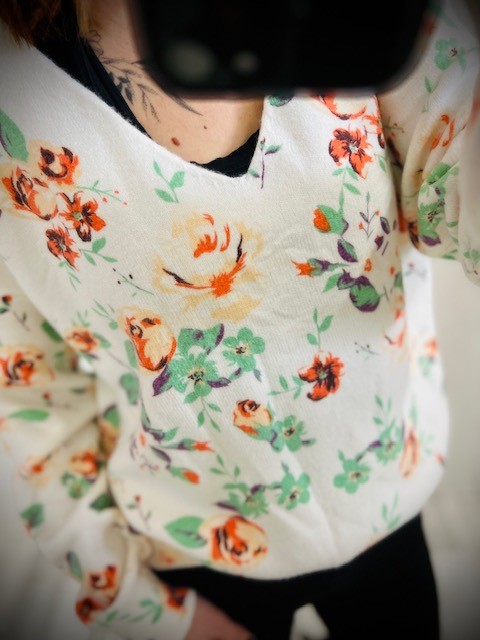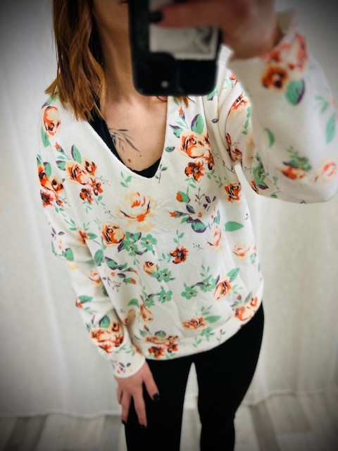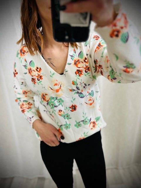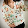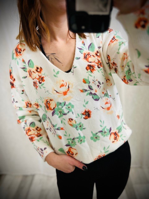 Le conseil des filles : pull trĂšs doux, avec un imprimĂ© de printemps, pourra aller jusqu’Ă un petit 44.